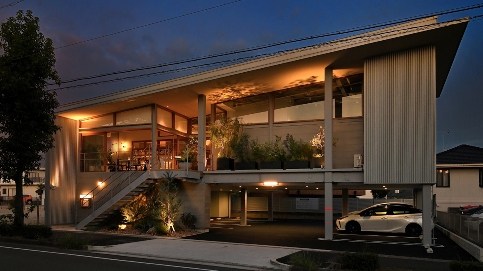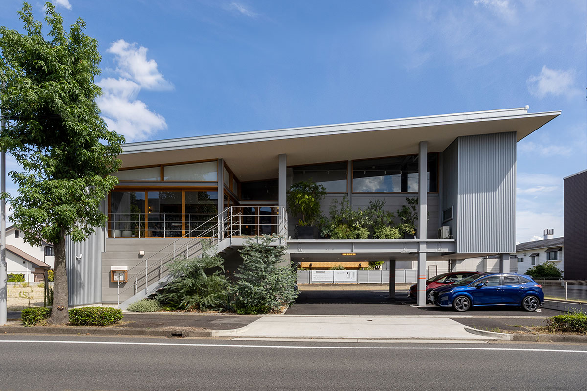 大胆にせり出した屋根、高くとられた天井が、開放的で非日常的な空間を演出。まるで空に浮かぶような感覚とともに、光と風が心地よく通り抜ける設計は、訪れる人の五感に静かに響きます。料理を味わうだけでなく、空間そのものが記憶に残るキッチンとして設計しております。