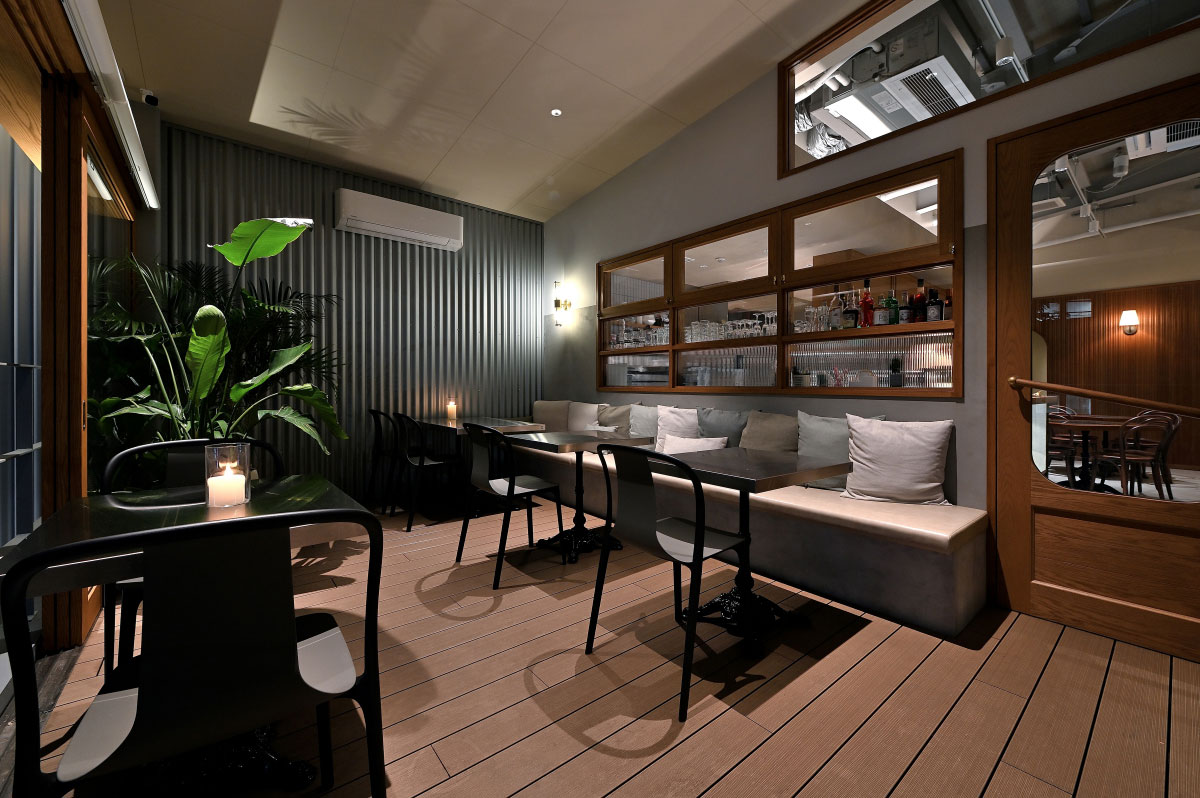 クチーナ・エムのテラス席は、空調設計にこだわり、季節を問わず快適に過ごせる空間です。
