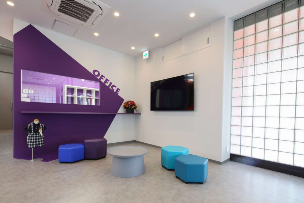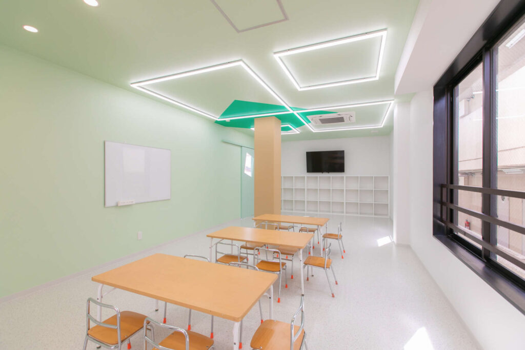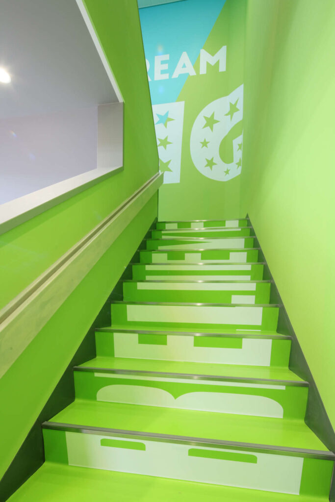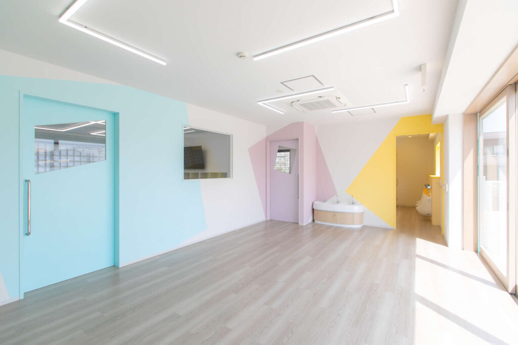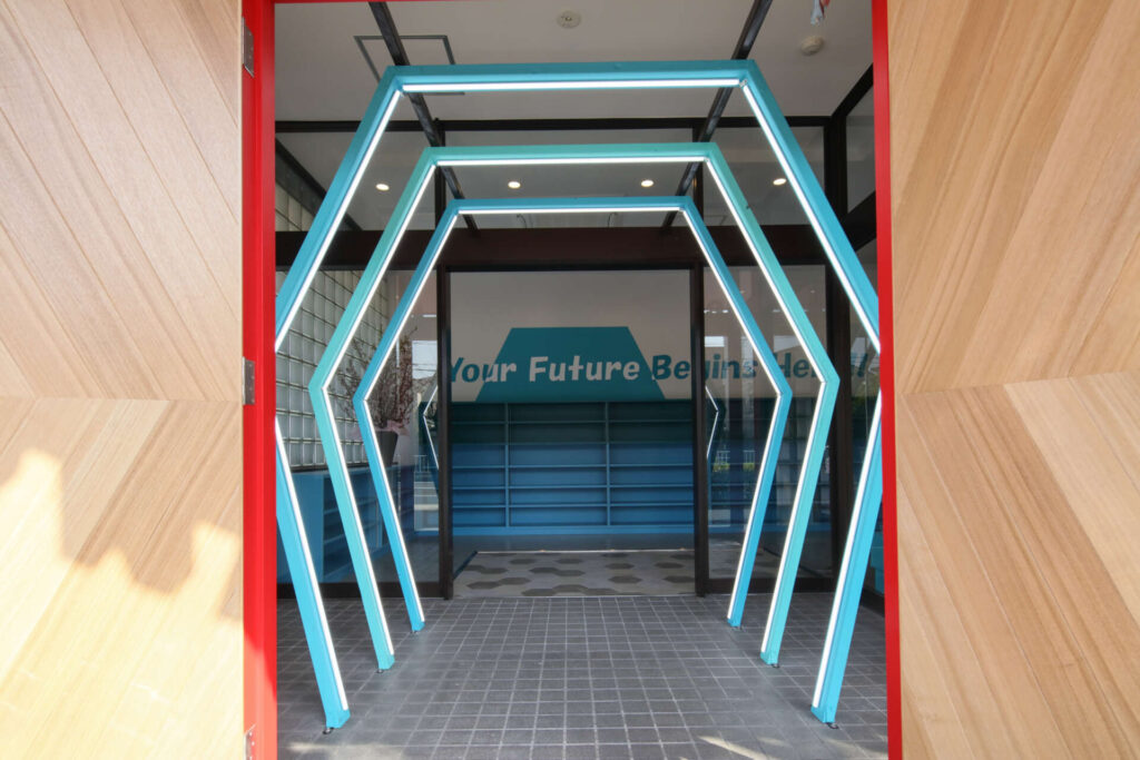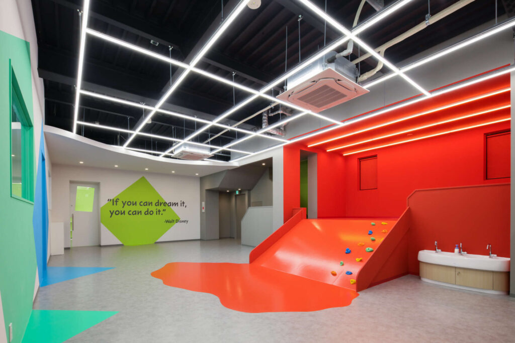 エントランスをくぐると視線を引き込む LED ゲートが子どもたちを迎え、「Your Future Begins Here」のメッセージが空間全体に期待感を演出します。内部は大胆なカラーリングと幾何学パターンで構成され、五感を刺激し、子どもたちの日常に冒険心と創造力を与えるデザインとなっています。