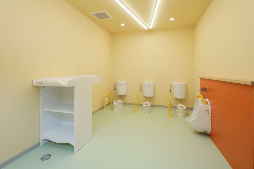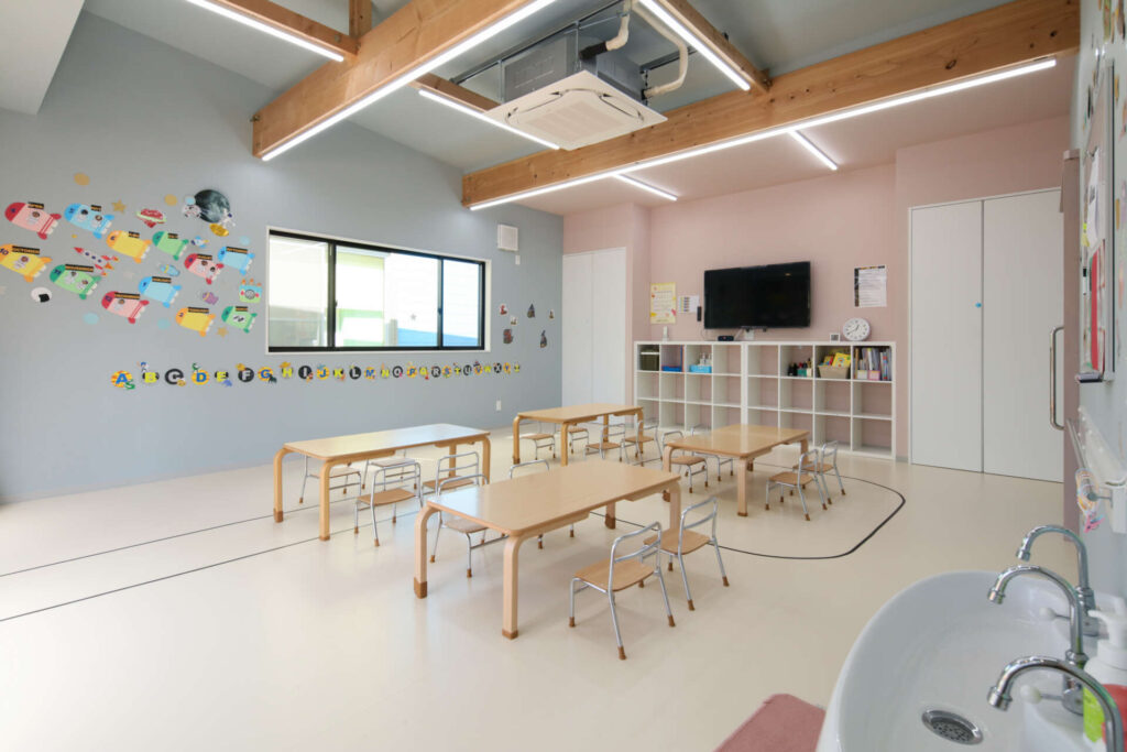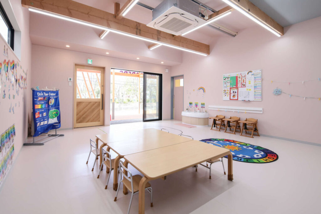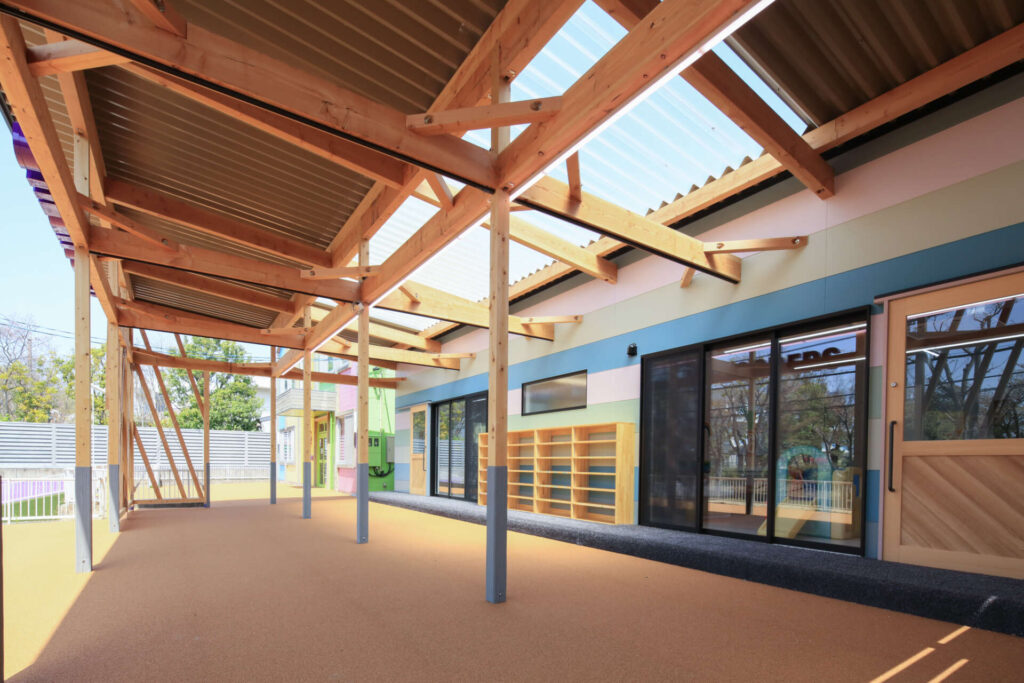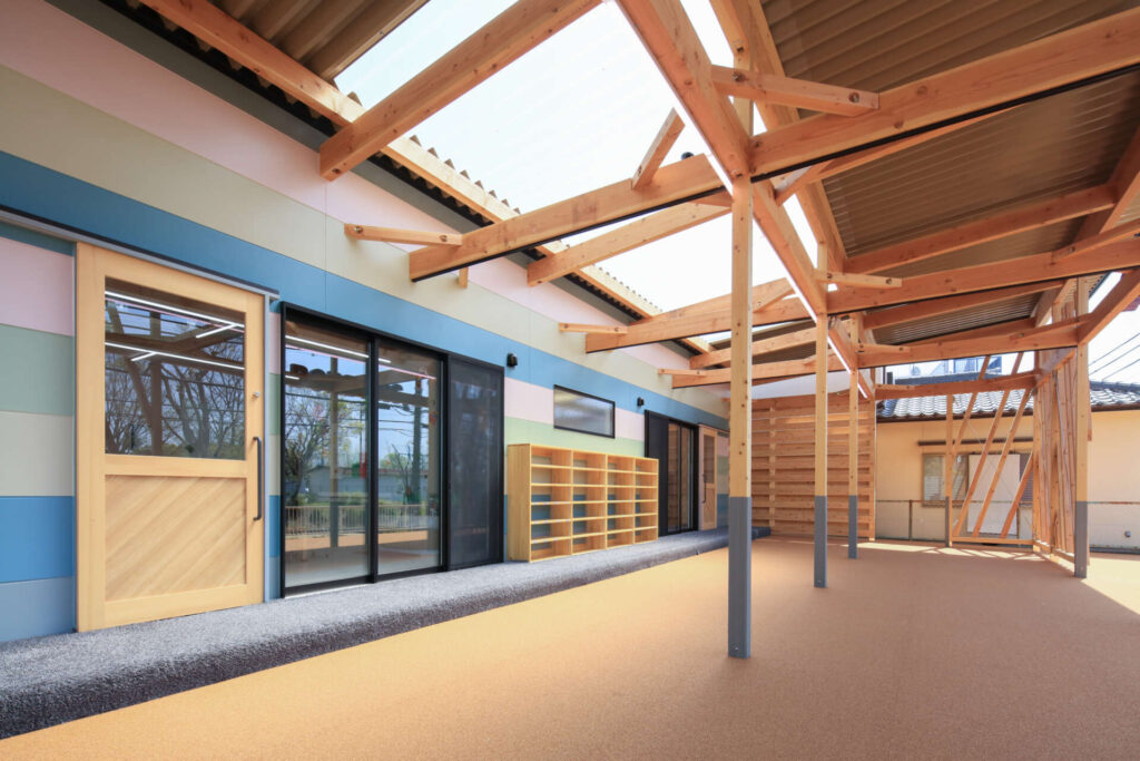 多様な色彩が織りなす外壁は、子どもたちひとりひとりの個性を尊重するシンボルとして、屋内には自然光がたっぷりと差し込み、構造美を生かした梁のデザインが空間にリズムと遊び心を与えます。