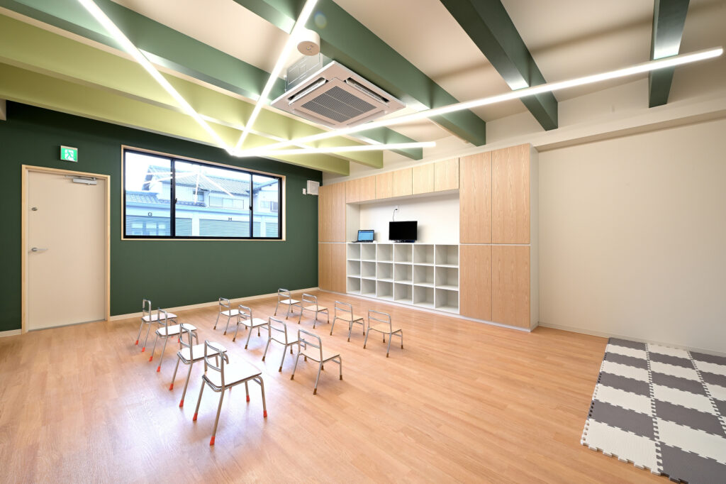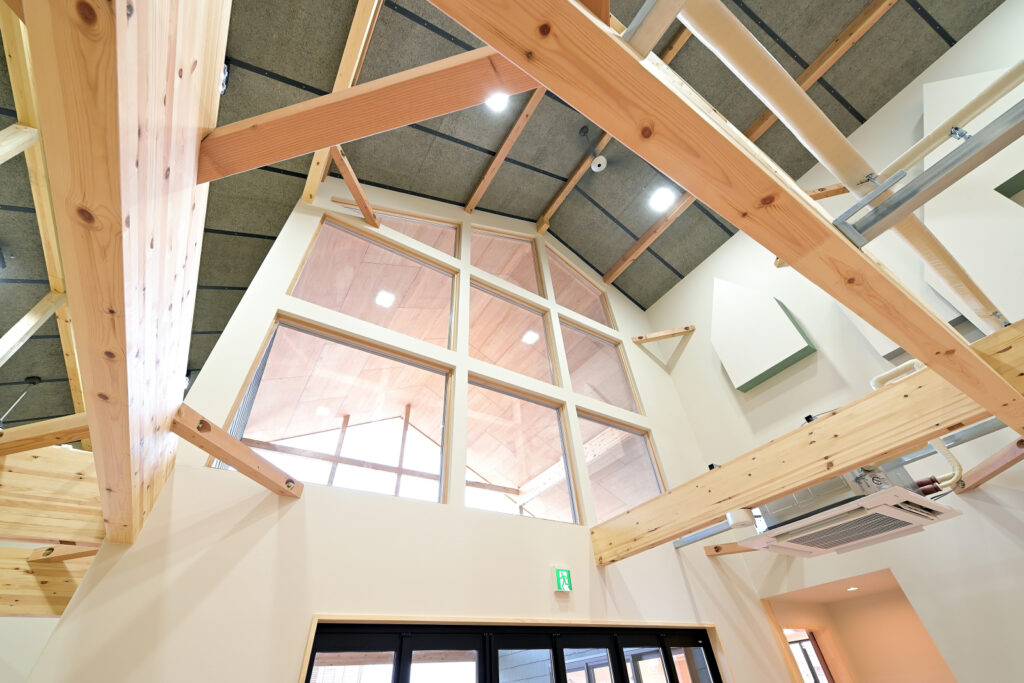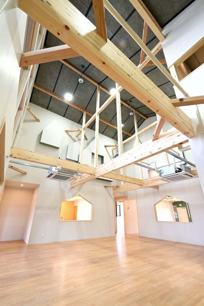 内装は、空に向かって伸びるような吹き抜け構造と木の架構がダイナミックに広がり、遊び心あふれる窓の形や天井の色彩が、学びの場に「発見」と「好奇心」を添えています。アクティブな動線と安全性を兼ね備えたゾーニング、思いっきり遊べる園庭と一体感を持たせたウッドデッキテラス、外と中の“境界”をやわらかくつなぐことで子どもたちの五感をのびのびと解放できる設計になっています。この園舎は、「学ぶ」ことも、「遊ぶ」ことも、「集う」ことも、すべてがシームレスに混ざりあう“境界のない空間”。未来を生きる子どもたちに、心地よく、たくましく育ってほしいそんな想いをカタチにしました。