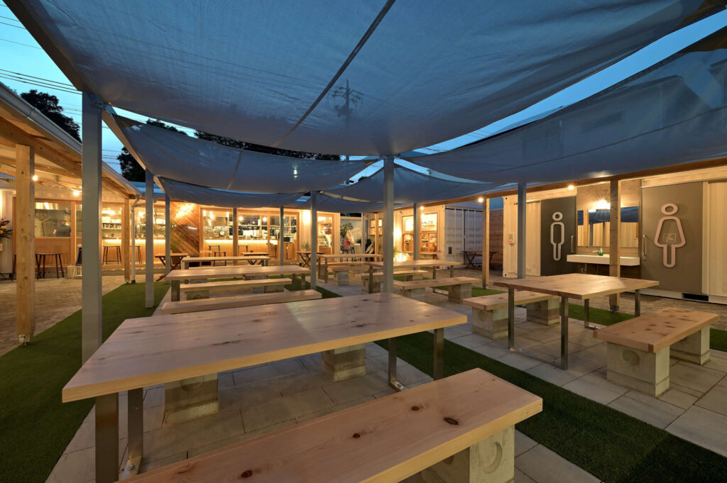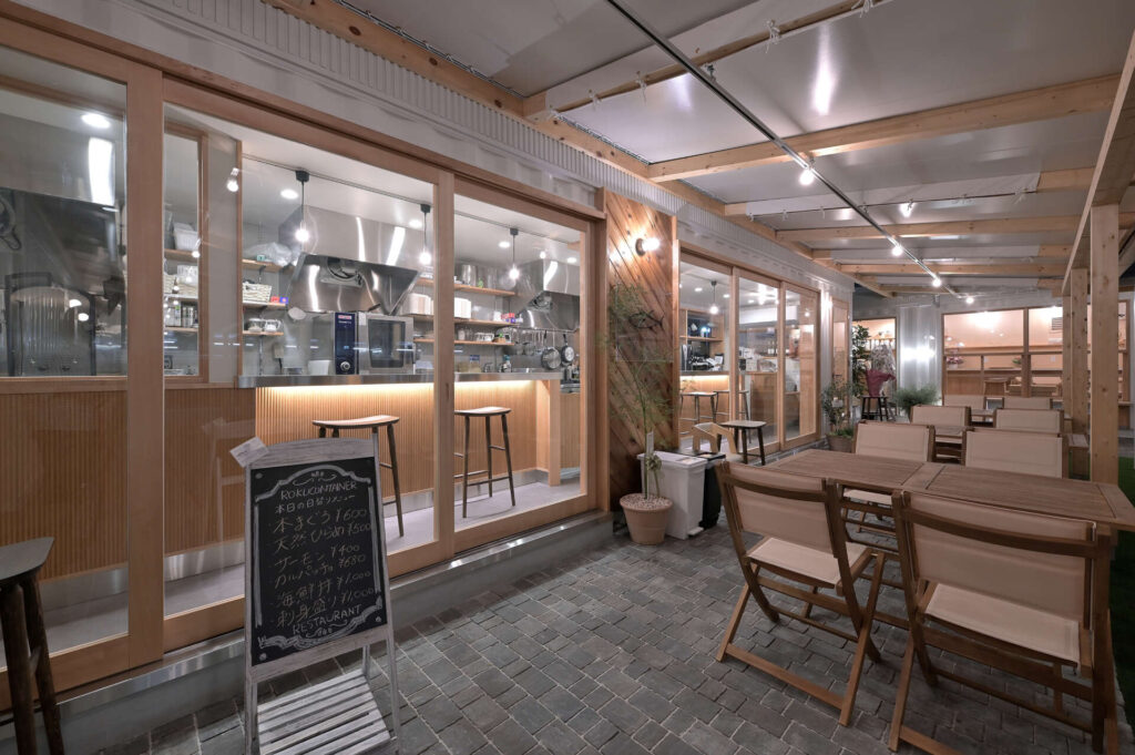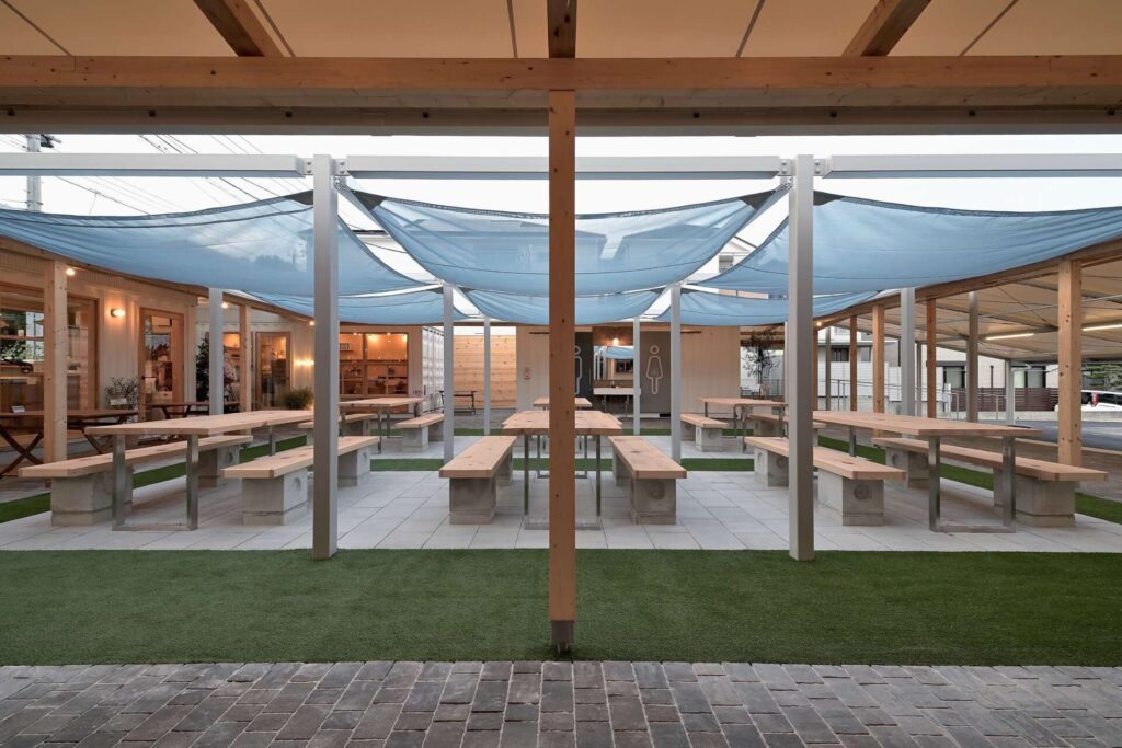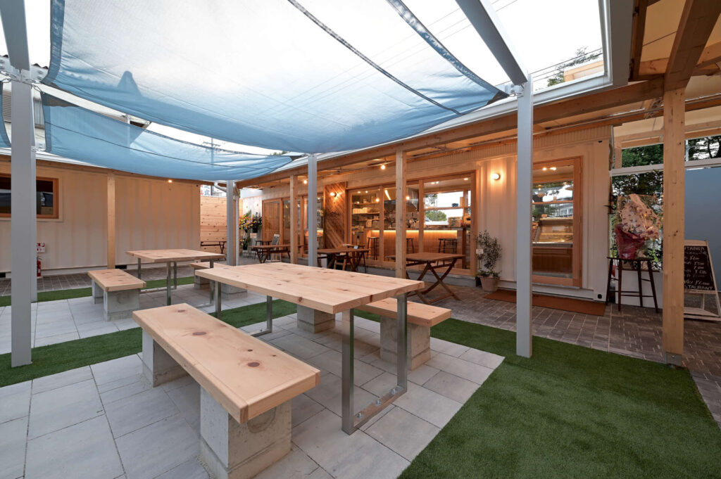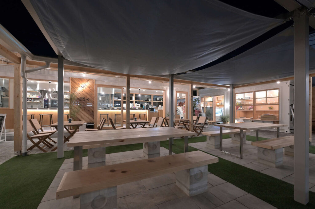 「おいしい」「たのしい」が交差する“食と時間”のマーケットとして、ショップ、レストラン、カフェが緩やかにつながり、回遊性のある動線を生み出しています。屋外テラスには可動式の屋根やシェードを配し、光と風を感じながら心地よく過ごせる設えに。