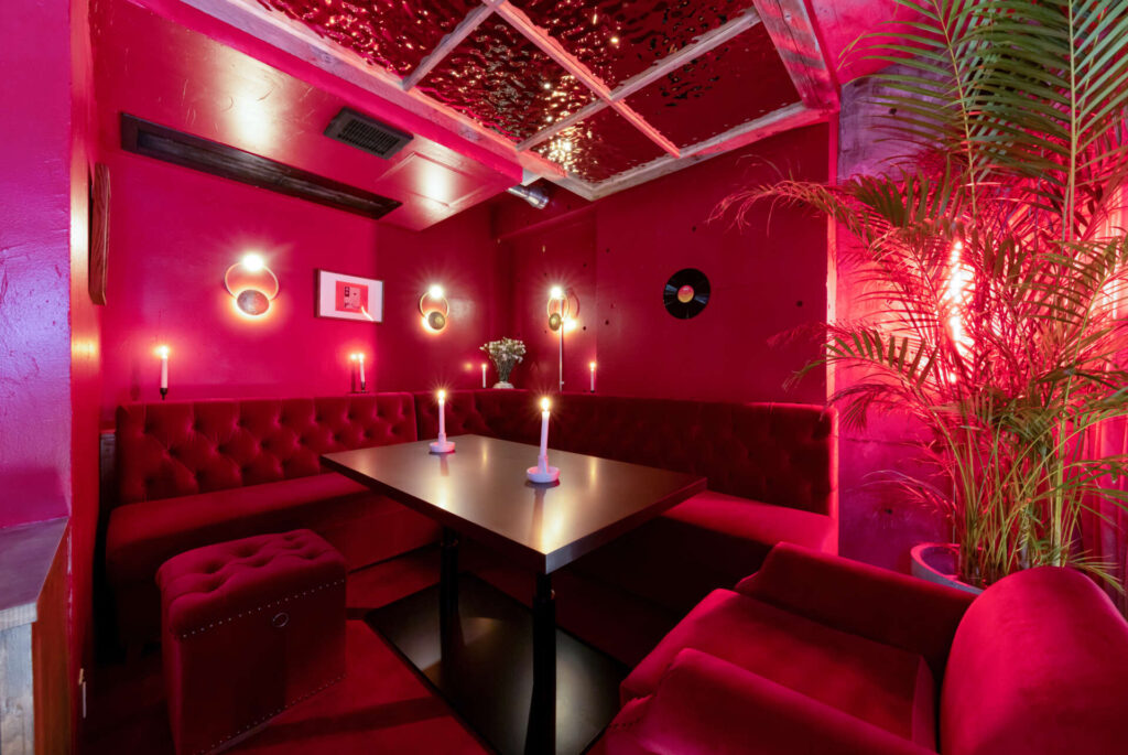 その下に広がる空間は、表情を変える 3 つのゾーンで構成されています。グリーンのファブリックが落ち着きを与えるダイニング、情熱的な赤が包むプライベートラウンジ。