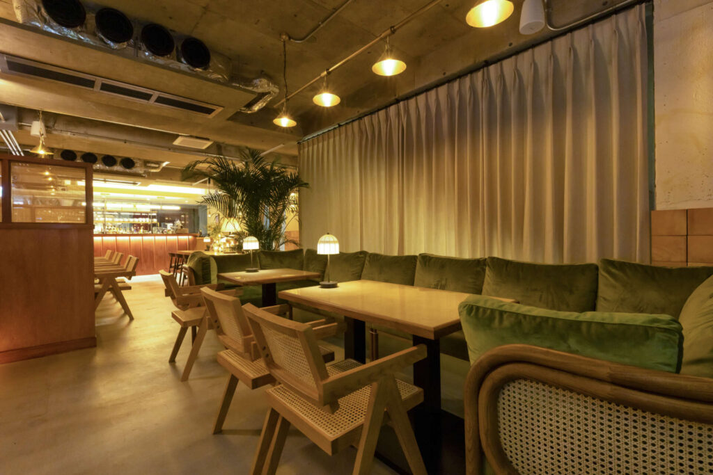 The space below is composed of three zones that change expression. A dining area with green fabrics that provide a sense of calm, and a private lounge enveloped in passionate red.