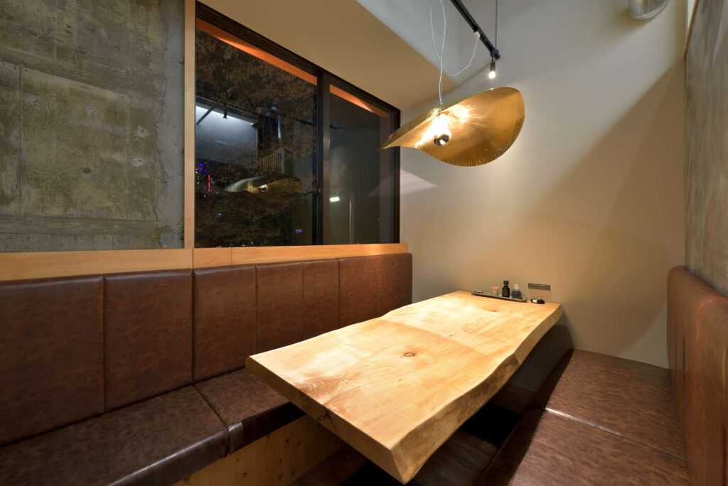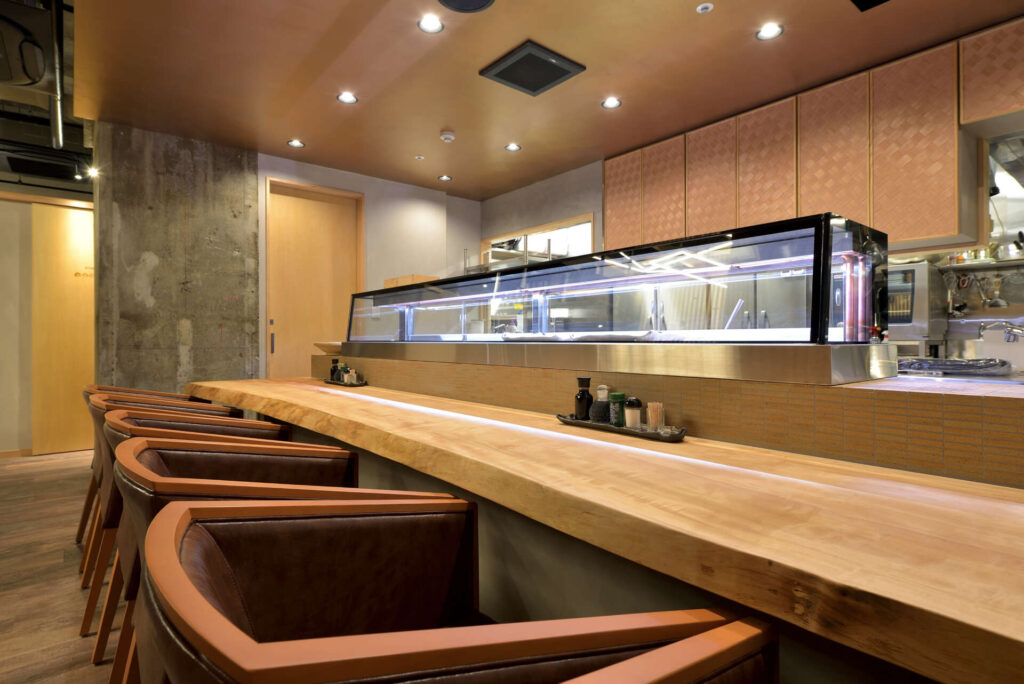 カウンターの曲線、壁面のアート、座敷エリアの間の取り方にもこだわり、お客様が長く心地よく過ごせる空間に仕上げています。