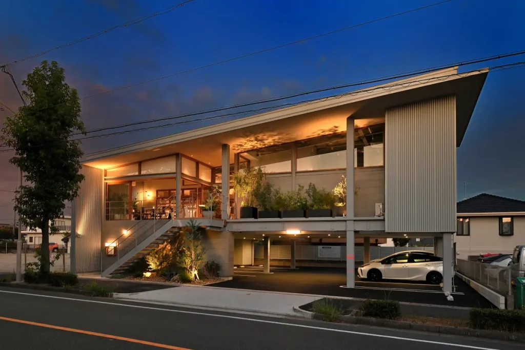 建物全体は鉄骨構造を活かし、1 階は駐車スペースとしてオープンにすることで、敷地を最大限有効活用しながら、建物の浮遊感を演出。